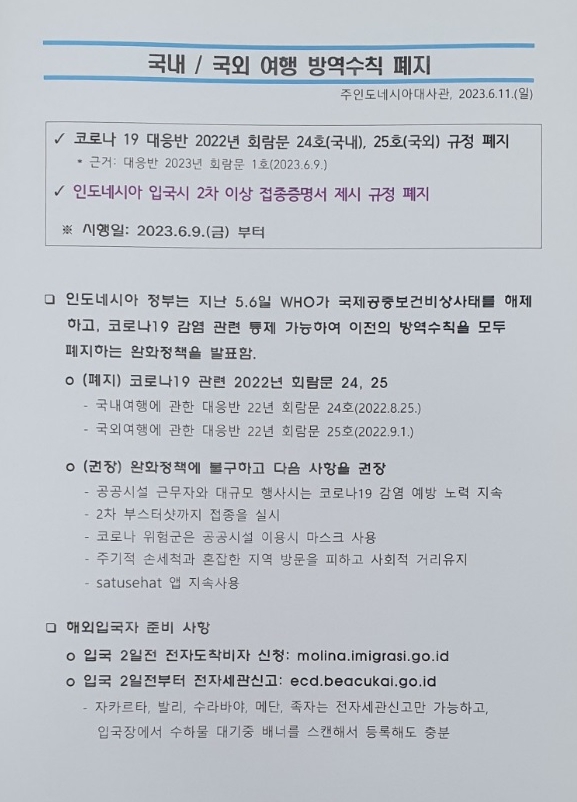 2023.6.9일(금)부터 인도네시아 정부는 WHO가 국제공중보건비상사태를 해제하고,